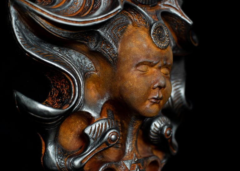 Cada escultura nace de la inspiración en mundos oscuros que habitan en este, fusionando formas orgánicas y surrealistas que cuentan historias sin palabras.